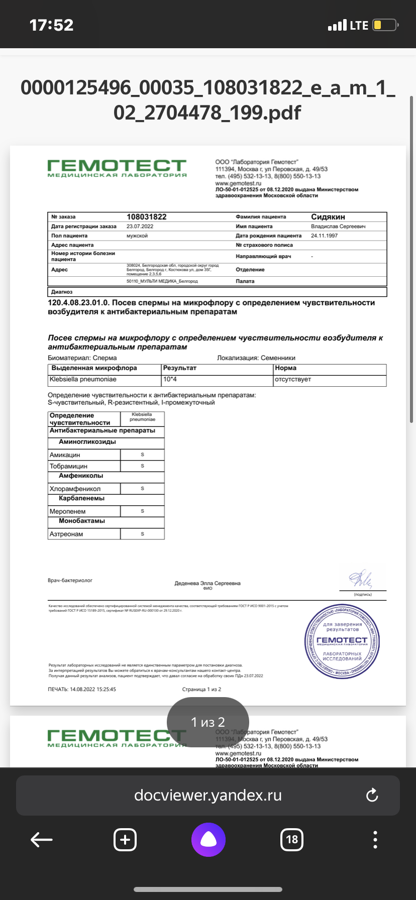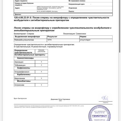 В начале июне почувствовал резкую боль в мошонке справа, в основном при ходьбе. К вечеру того же дня прошло. После этого через какое то время стали беспокоить ноющие боли в области мошонки , низ живота, и дискомфортные ощущения в области заднего прохода и под мошонкой. Связи с положением тела, родом занятий не имеется. При первом посещении уролога был назначен препарат простотекс, лечение которым результата не дало. После этого было проведено узи мошонки ( все хорошо), анализ крови биохимия и общий , пса, а также онкомаркеры предстательной железы, кишечника и тд. Все в порядке. При анализе выявили повышенные тромбоциты, гемотокрит, креатинин. Проведено узи почек ( все хорошо) После этого улучшил питьевой режим , но креатини вырос и составляет 121. Далее сдал сперму на бак посев в котором была выявлена палочка клебсиэла пневмонии 10(4). Ввиду сложного рабочего графика и командировок сперму сдавал уже в августе . К этому моменту состояние несколько улучшилось , но дискомфорт ещё остаётся. Болит не каждый день и не весь день, но все таки болит . После этого со всеми вышеуказанными анализами направился к врачу. Врач поставил диагноз бактериальный простатит. Назначил лечение физиотерапия электрофорез и магнитотерапия, массаж простаты, левофлоксацин на 28 дней , бактистатин, уколы простакор и циклоферон, флуканазол, отвар бруснивер для почек, контроль анализов через две недели после лечения . Вопрос : является ли диагноз верным , является ли лечение адекватным, каков шанс на выздоровление?