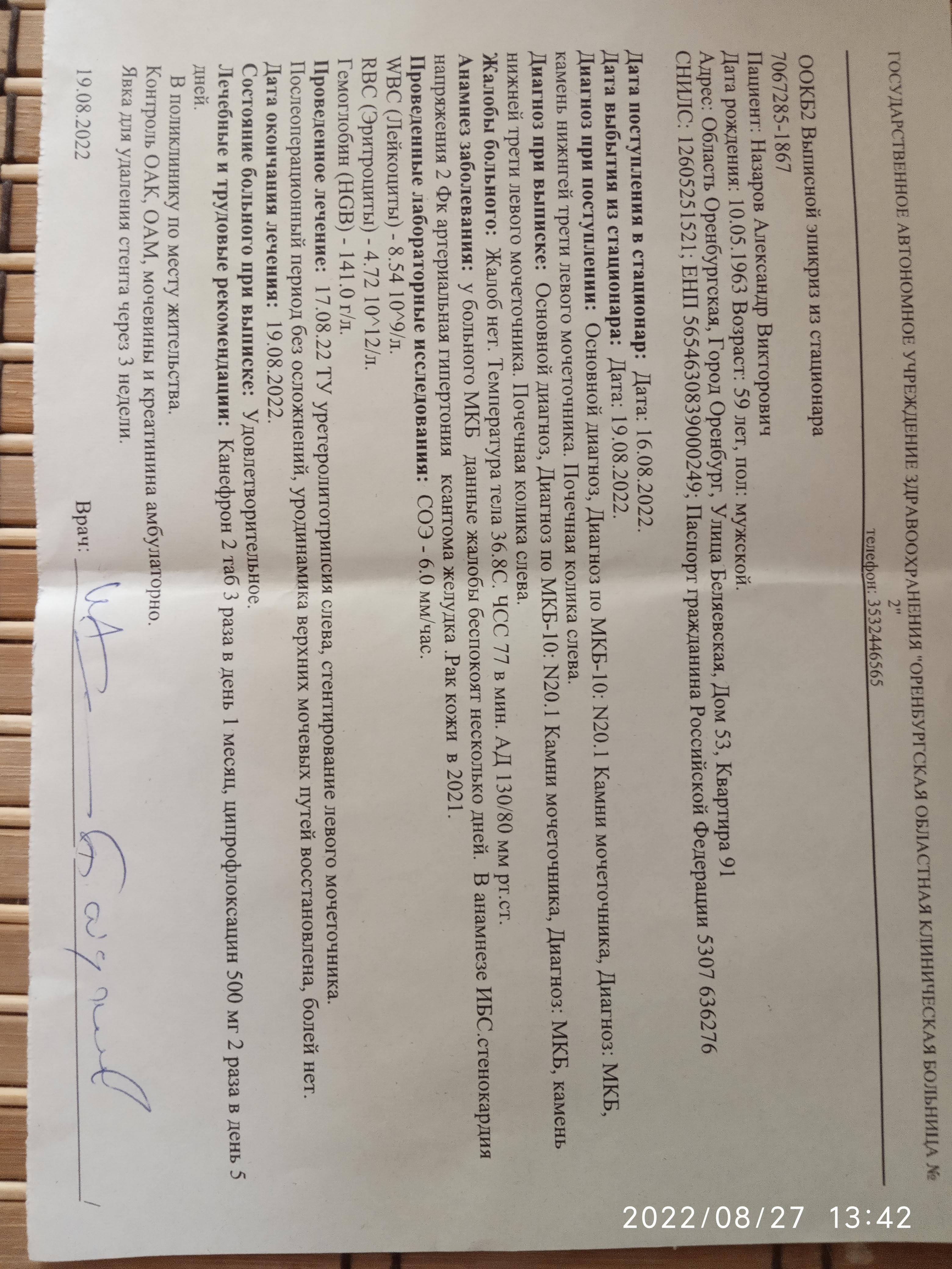 Добрый вечер! Учитывая, что у вас сейчас установлен стент после дробления множественных камней мочеточника, жжение может быть обусловлено еще и наличием стента - это называется "стент-ассоциированные симптомы". Вероятнее всего, тут целый комплекс причин - стент, отхождение оставшихся фрагментов камней, солей. Оксалит не обладает такими побочными эффектами, как я и писала ранее, его нужно принимать длительное время, потому что эффект развивается постепенно. Канефрон, который Вам назначил Ваш лечащий врач, тоже таких побочных эффектов не вызывает. С уважением.