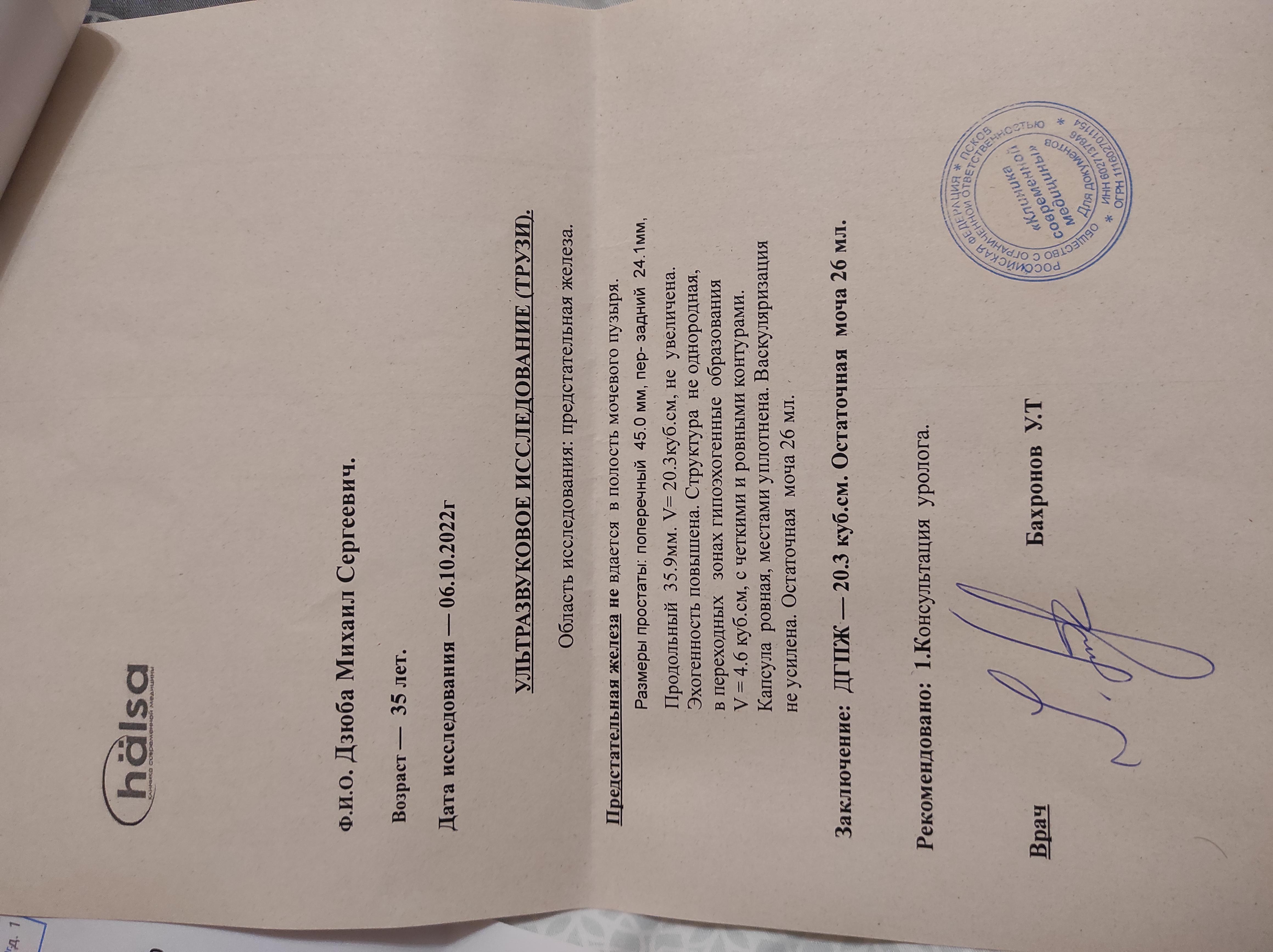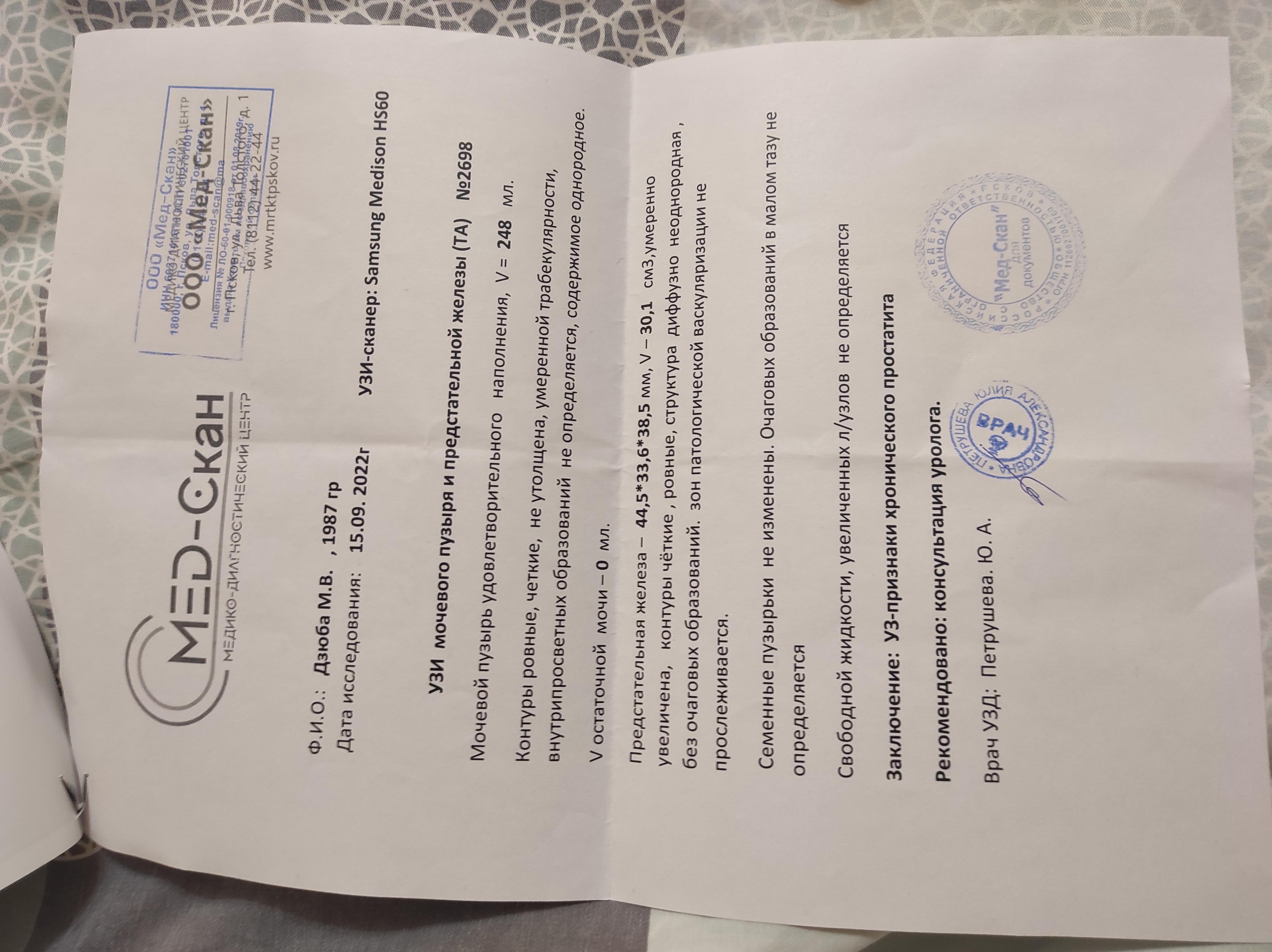 Добрый день! 1. У Вас нет признаков аденомы простаты. 2. Анализы на ИППП надо сдать - обычно мы назначаем обследование обоим половым партнерам, так как в силу особенностей иммунитета у одного из партнеров инфекции могут не проявляться симптоматически и не выявляться при обследовании. Особенно, если планируется беременность - уреаплазмы, микоплазмы, хламидии, ВПГ, ВПЧ, гарднереллы, гонорея, трихомониаз, сифилис, бандиты. 3. Показатели спермограммы достаточны для зачатия естественным путем. Чтобы повысить вероятность наступления беременности - можете пропить Мираксант - в течение 3-6 месяцев. Удачи.