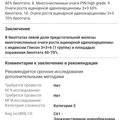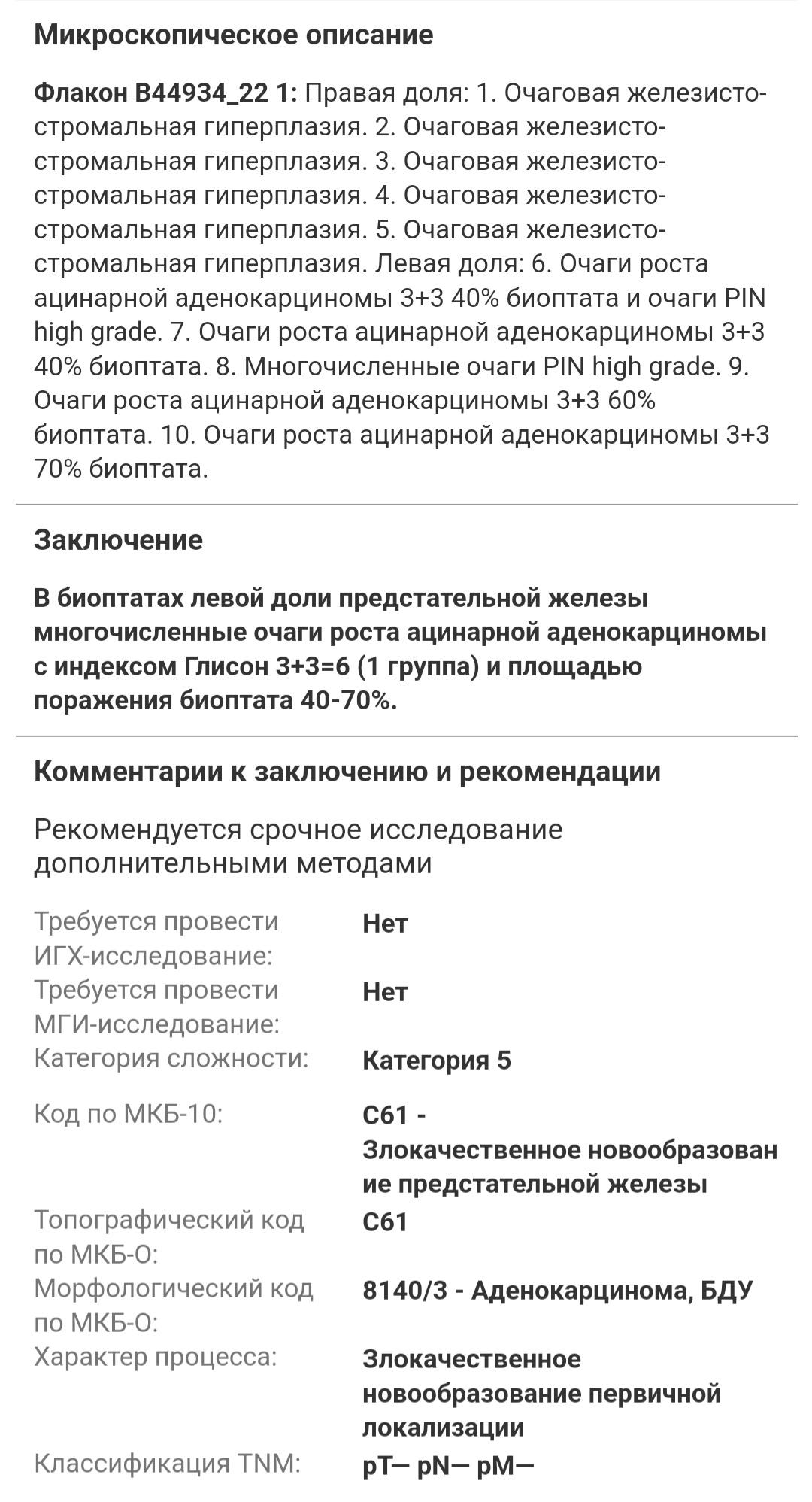 Добрый день! 1. Действительно, биопсия показывает наличие злокачественного новообразования в предстательной железе. 2. Чтобы определиться с методом лечения, а сейчас их очень много и они подбираются индивидуально для каждого пациента, нужно правильно стадировать опухоль, то есть определить ее стадию, наличие или отсутствие ее распространения на другие органы, лимфоузлы, костную ткань. Для этого надо выполнить МРТ малого таза (не ранее, чем через 1 мес после биопсии), ПЭТ-КТ всего тела. 3. В настоящее время пациенты с этим заболеванием живут десятки лет, главное - выполнять все назначения врачей. 4. Обильное питье не имеет к этому никакого отношения. С уважением.