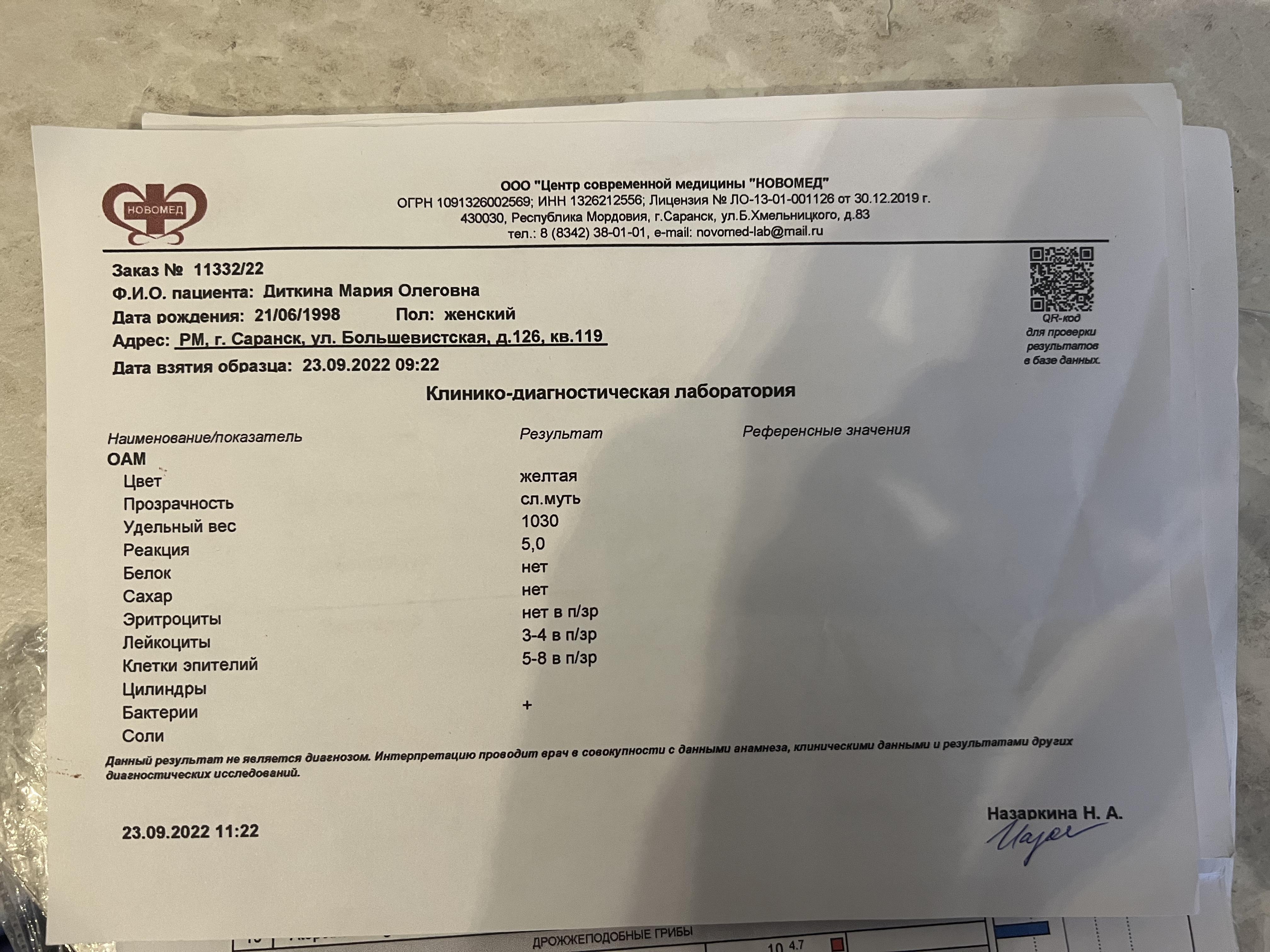 2. В общем анализе мочи лейкоциты в норме, бактерий мало.