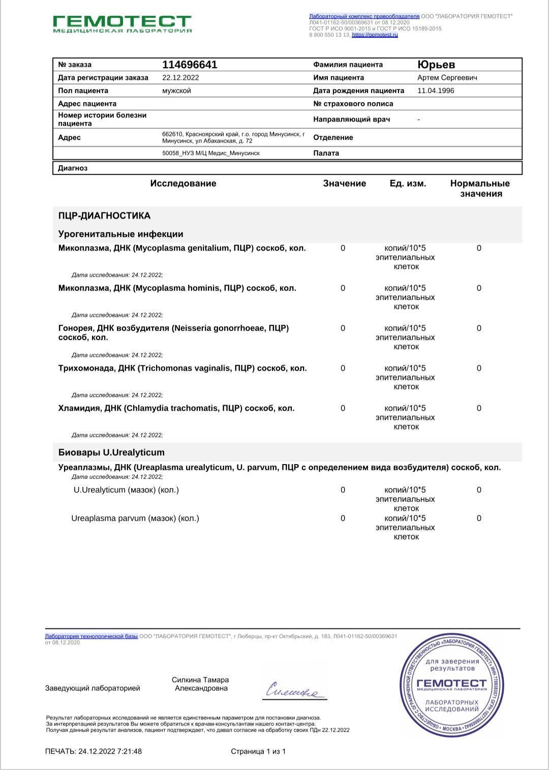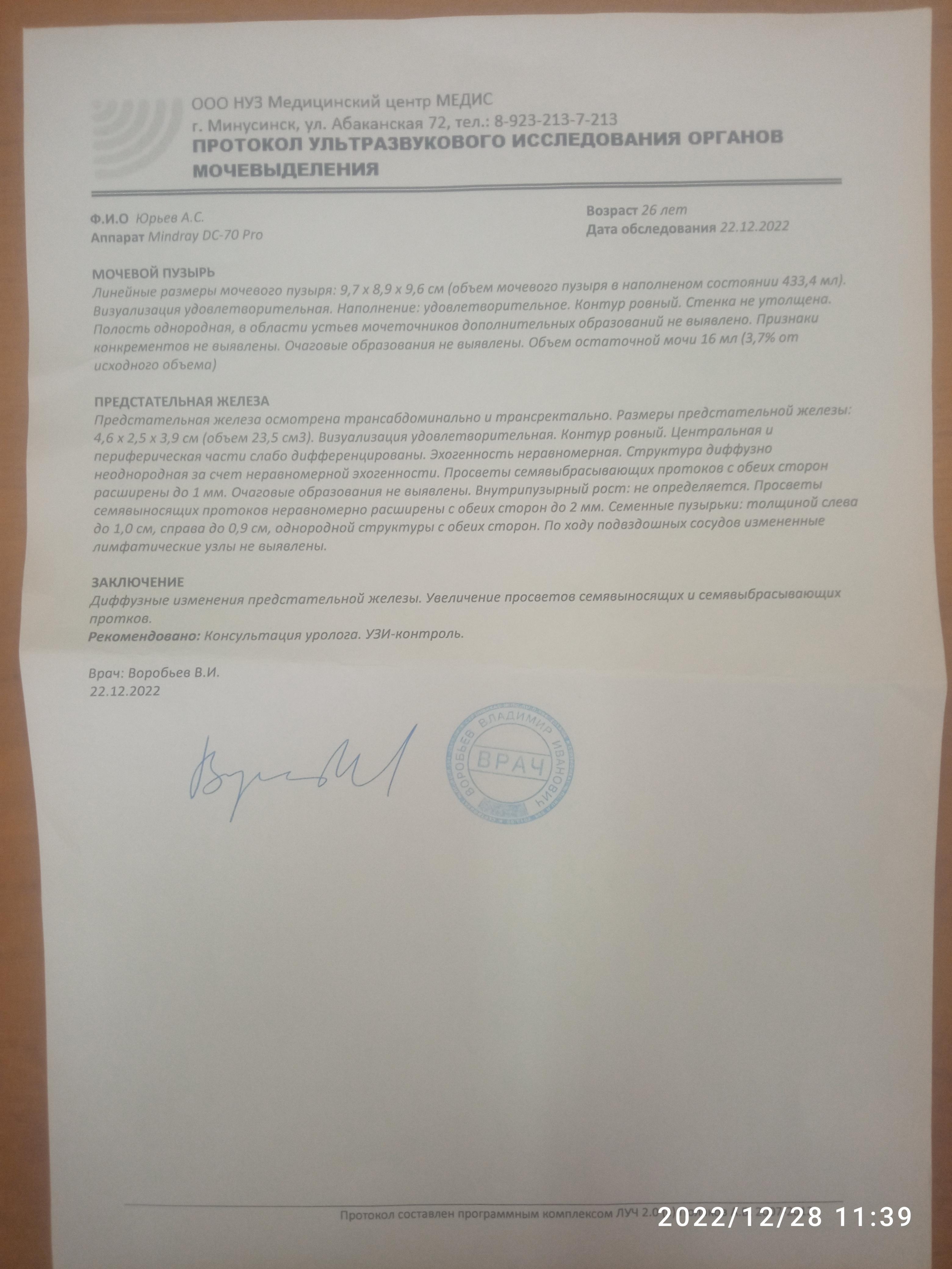 Здравствуйте, У меня начались проблемы с с того что во время мочеспускания и после оставалась чусвство сжения в урерте и в заднем проходе. Была общая слабость в организме, но температуры небыло. Также тянуло переодически яйца и слабость в ногах. Я обратился к врачу урологу он мне назначил УЗИ простаты и соскоб на иппп, врача я предупредил что я употребил 1 таблетку Амокцацалина 500 и пил трехапол в течении 3 дней время со дня взятия анализа и употребление таблеток не прошло 7 дней. Всё же анализ был сдан с отрицательным результатом.