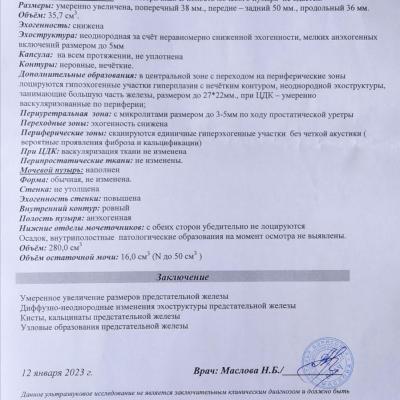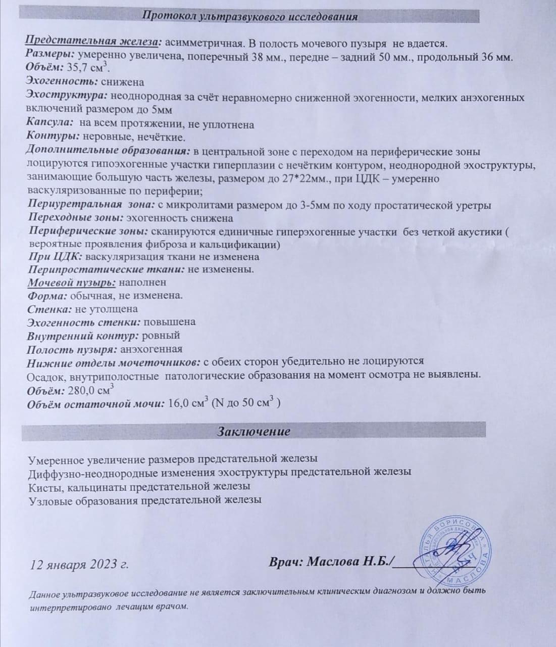 Здравствуйте.Сдал анализ ПСА,пришёл результат 12,свободный 0,8.остальные анализы кровь моча в норме.боли не беспокоют,сделали узи.результат прикрепляю.что это может быть.заранее спасибо!