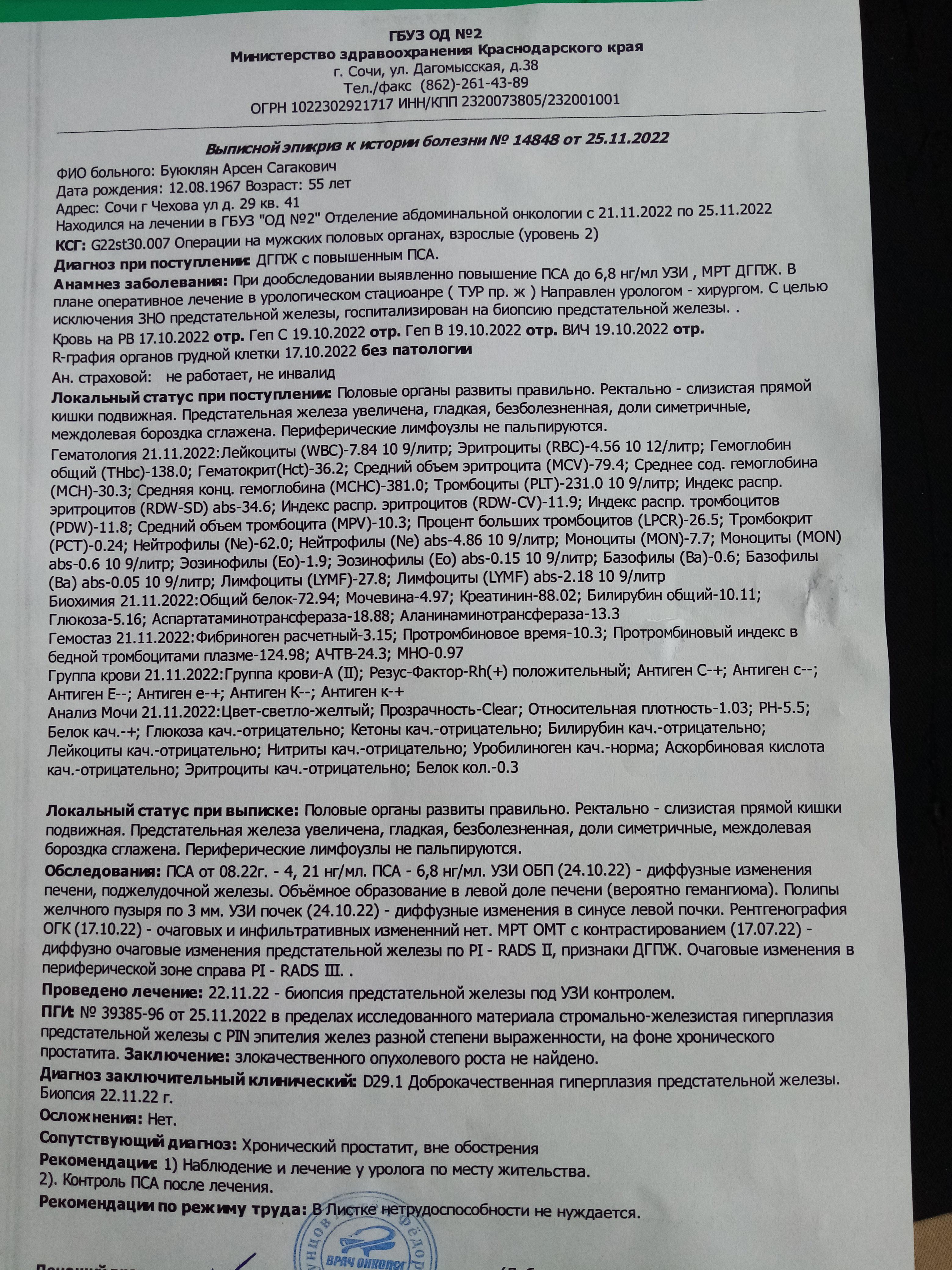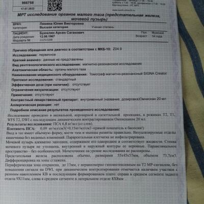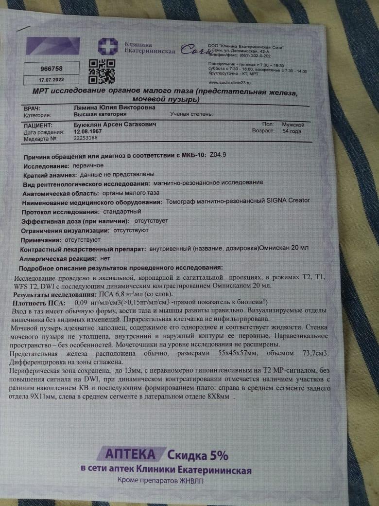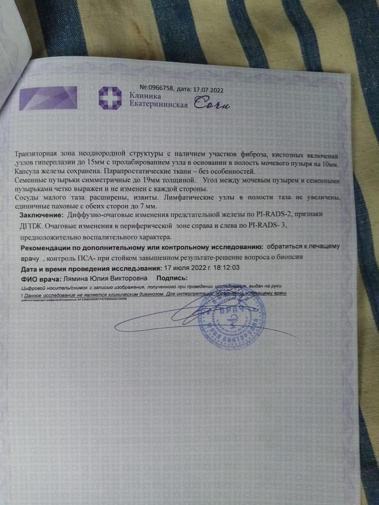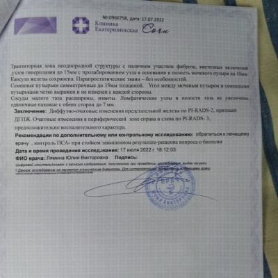 Добрый день! 1. Провести противовоспалительную терапию. 2. Сдать ПСА через 3 месяца, в дальнейшем каждые 6 мес. 3. Решить вопрос об адекватной терапии ДГПЖ. То, что Вы принимаете сейчас - не совсем то, что нужно. 4. Мы готовы Вам помочь на платной основе - очно или дистанционно. Телефон для записи на прием +7 901 723-45-35 Татьяна Дмитриевна (регистратура), она все объяснит. С собой возьмите все результаты обследований, которые у Вас есть, также их можно будет загрузить на нашу платформу, для предварительного изучения врачом. Прием будет вести кандидат медицинских наук, уролог, Шадёркин Игорь Аркадьевич, информацию о нем можете посмотреть https://03uro.ru/o-nas. Удачи.