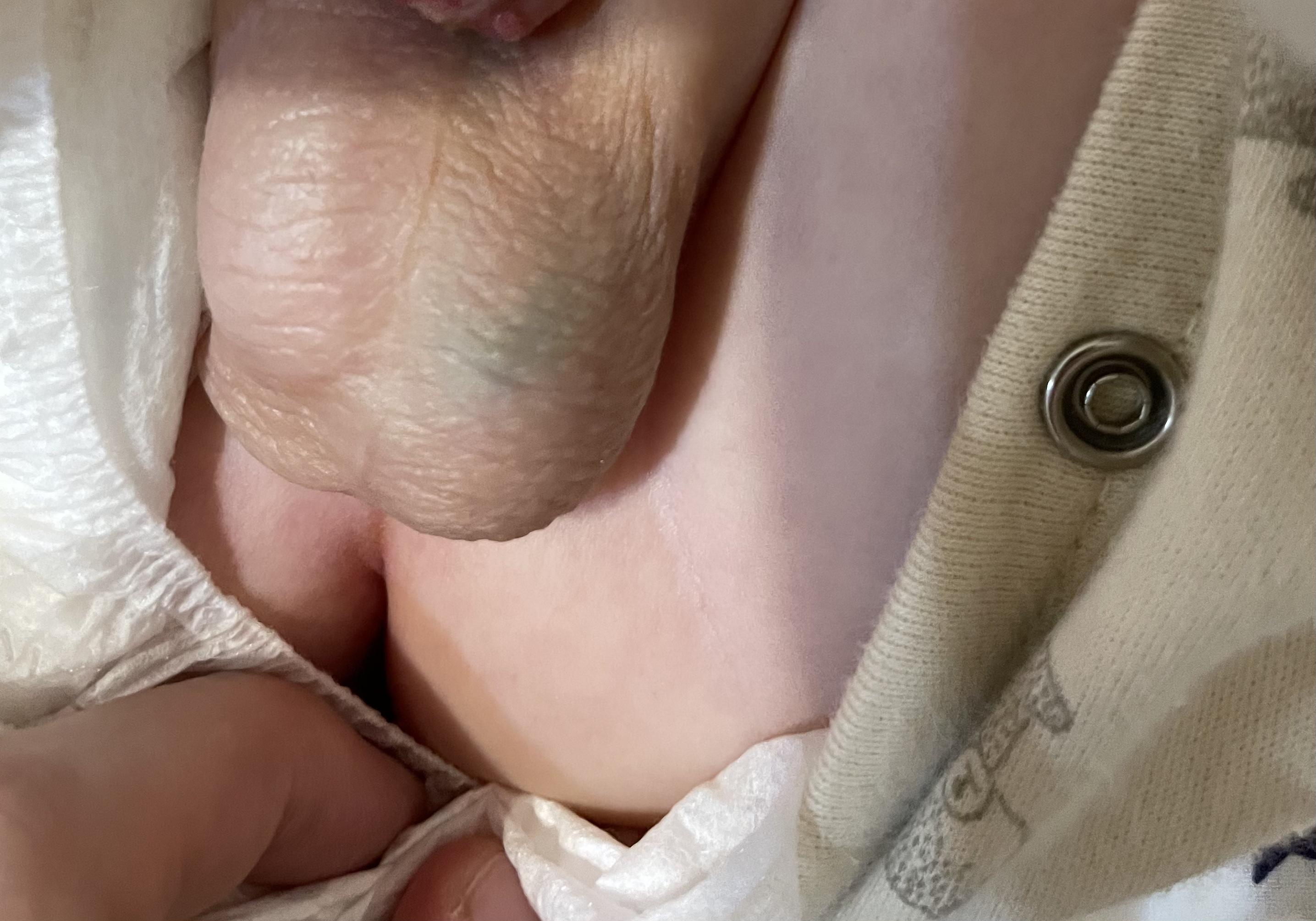 Здравствуйте, ребёнку 6 месяцев ровно,На третий день после обрезания появился синяк на левом яичке, как будто вена набухла, что это может быть?? У малыша это беспокойства не вызывает, к хирургу пока идти не вариант т к сегодня только пятый день и ещё не все зажило