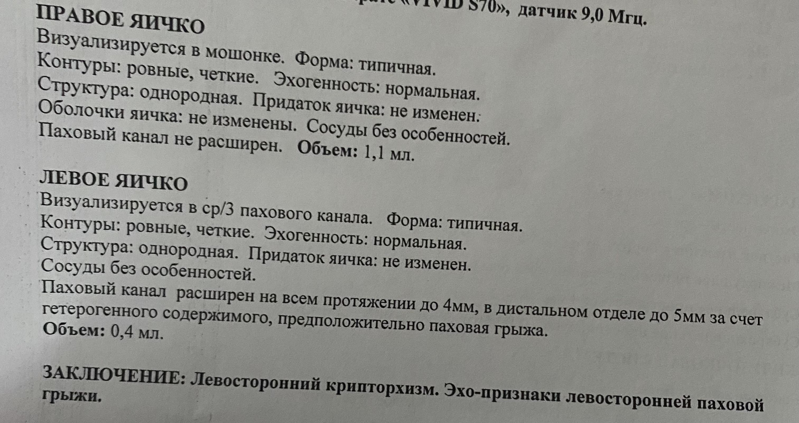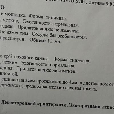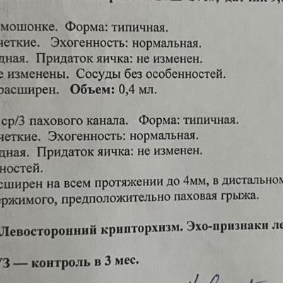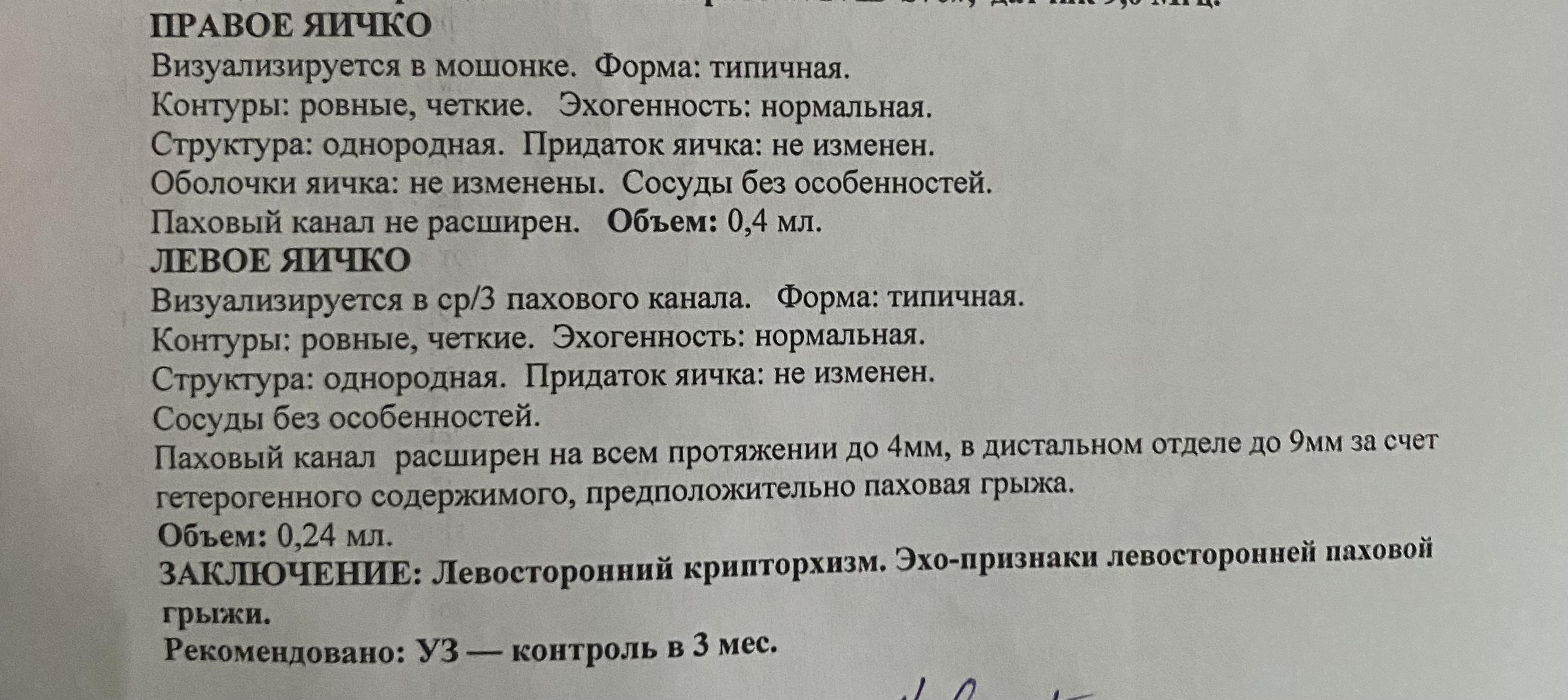 Здравствуйте, ребенок доношенный, возраст три месяца, с рождения-левосторонний крипторхизм, результаты узи прикрепляю. Есть ли шанс самостоятельного опущения яичка, или только оперативное лечение? И если паховый канал в дистальном отделе стал уже, это положительная динамика, или нет?