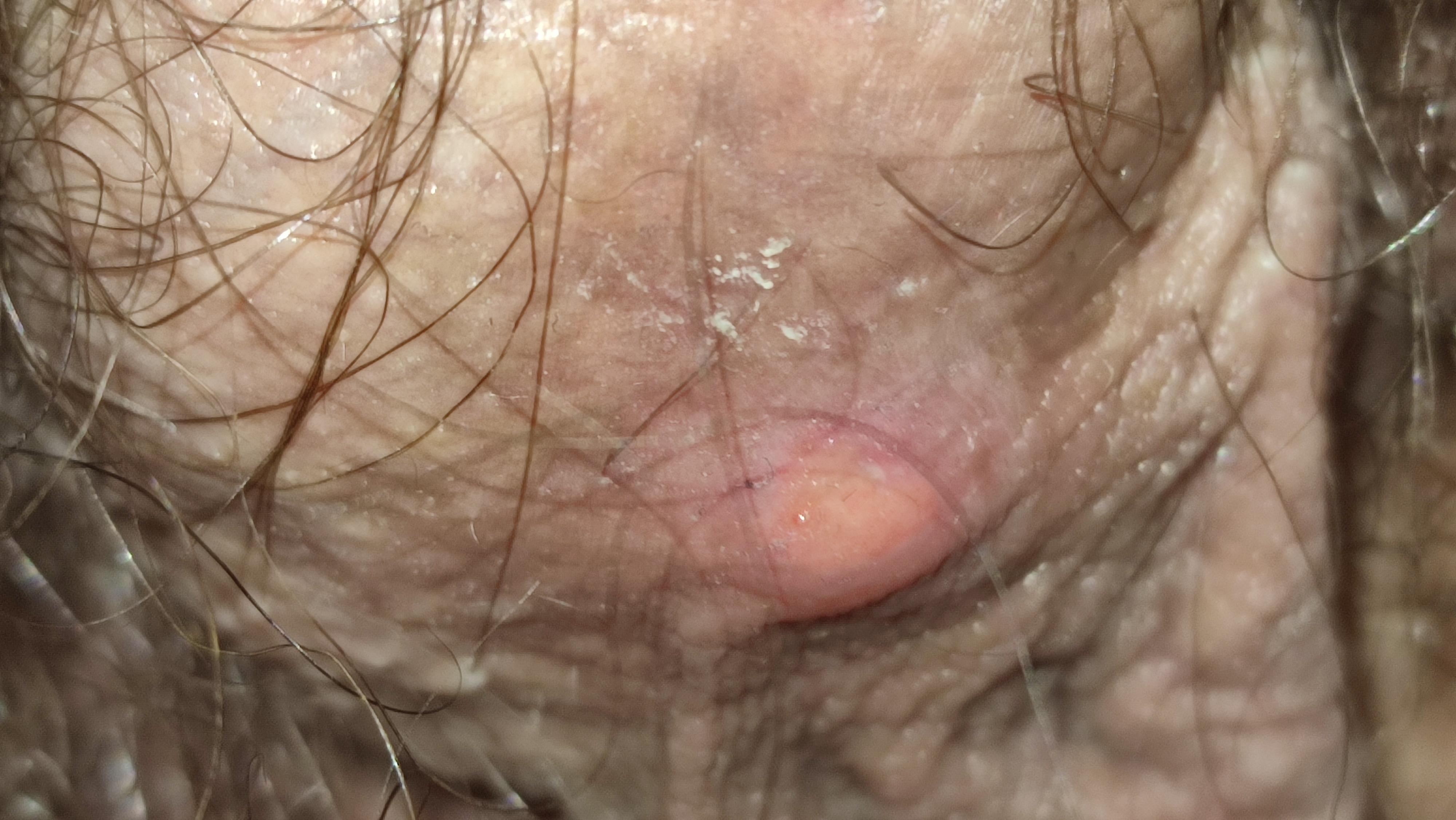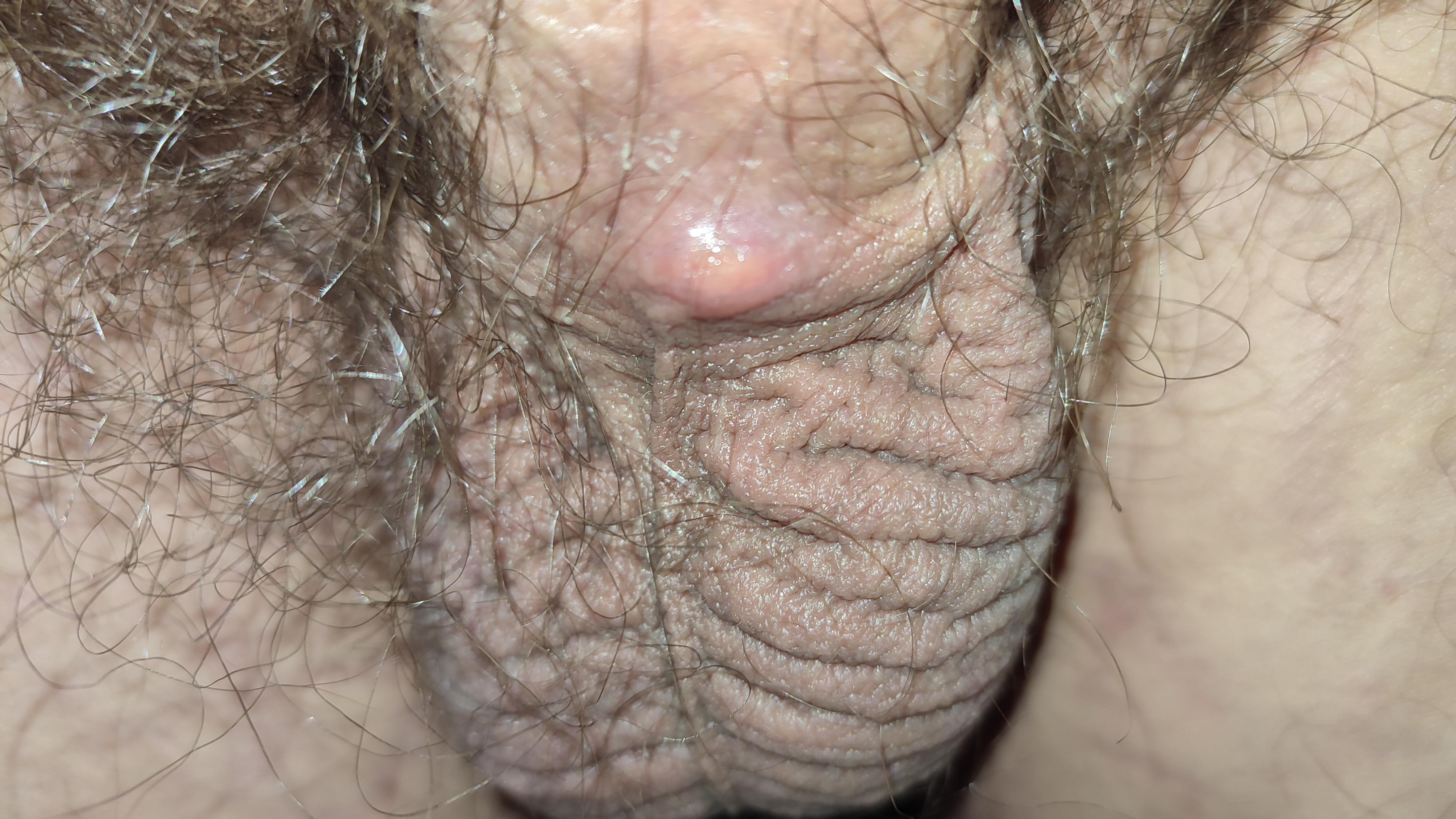 Это фурункул кожи мошонки. Как правило, это воспалившаяся сальная железа или луковица волосяного фолликула. Ни в коем случае нельзя это выдавливать. Обрабатываете спиртом 2-3 раза в день и держите в чистоте. Следите за температурой тела, размерами образования и болью. Если эти показатели будет ухудшаться Вам обязательно надо будет обратиться к врачу-урологу или хирургу на очный прием.