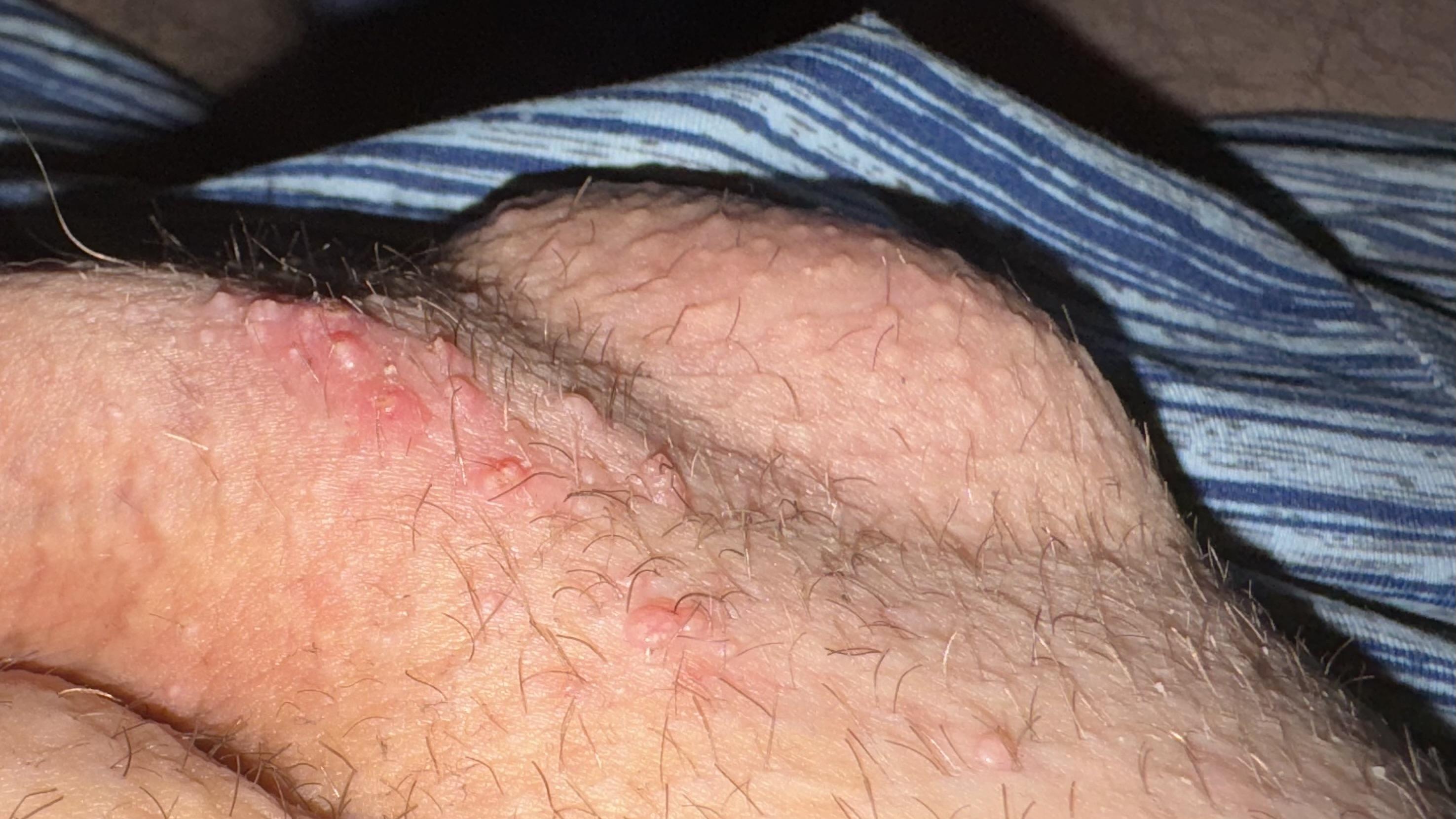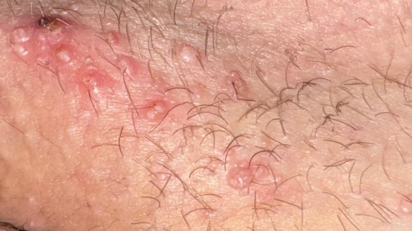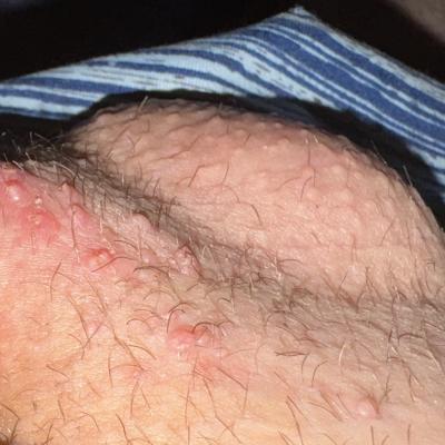 Пациент отметил появление высыпаний в паху около недели назад. Самостоятельно начал прием Ацикловира 500 мг 3 раза в день, предполагая, что это герпес. Однако, изменений в состоянии высыпаний не наблюдается.