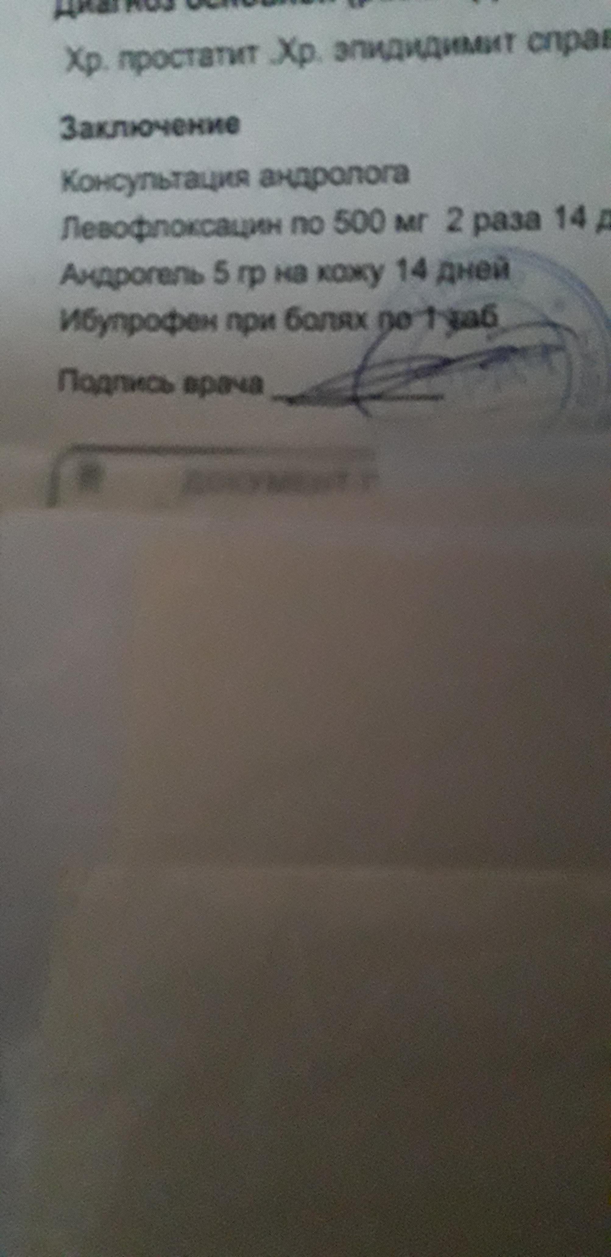 На основании представленного фото, пациенту был поставлен диагноз хронический простати и эпидидимит. Назначено лечение: Левофлоксацин по 500 мг 2 раза в день, курсом 14 дней. Также рекомендуется ибупрофен 5 г на ночь в течение 14 дней для снятия болевого синдрома. В назначении также указан Андрогель, гормональный препарат, который требует предварительного исследования уровня тестостерона в крови.