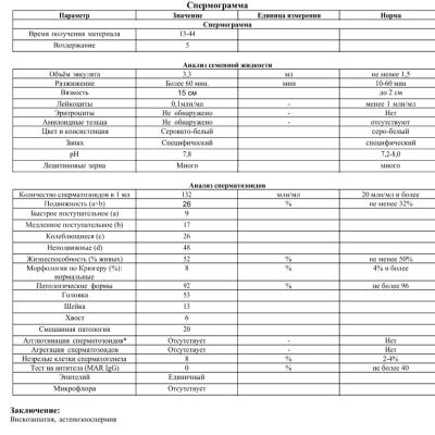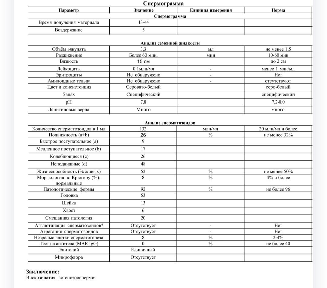 Несмотря на сниженные показатели подвижности и морфологии, количество сперматозоидов значительно превышает норму, что может способствовать возможности естественного зачатия.