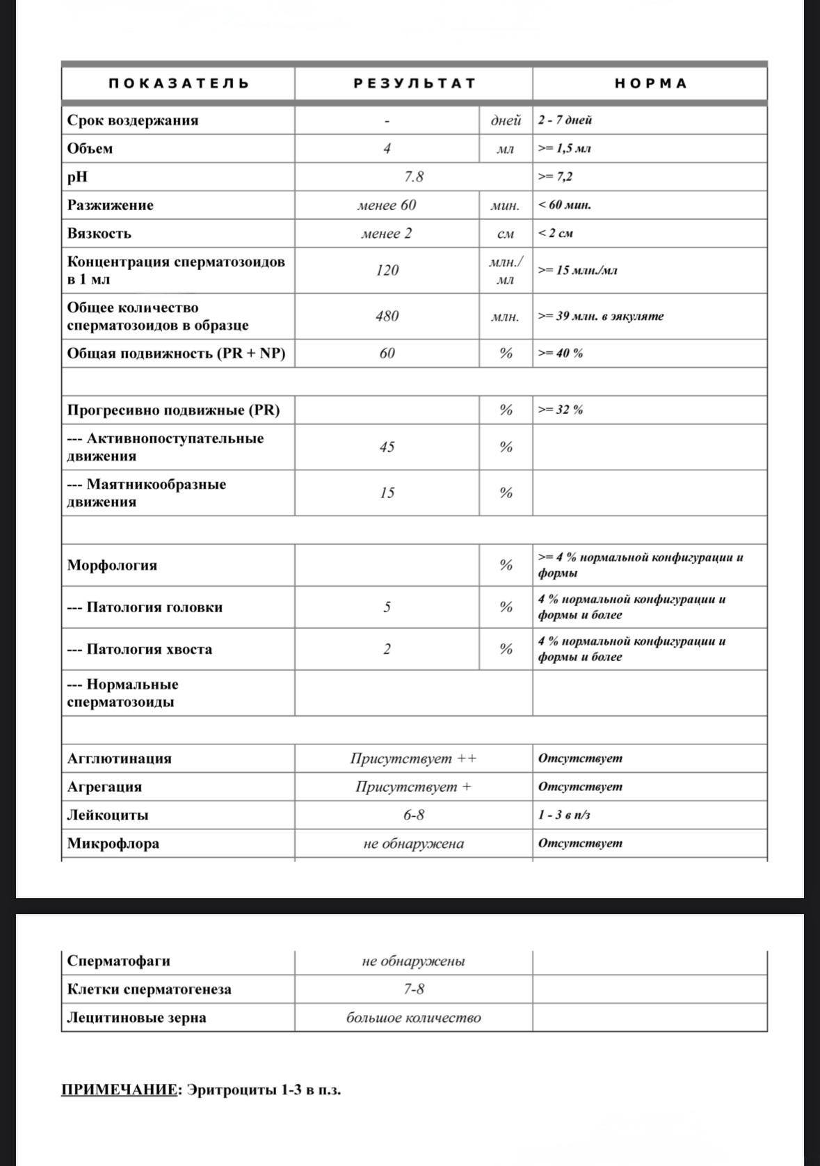 • Морфология сперматозоидов: Патология головки и хвоста в пределах нормы, но отсутствие данных о количестве нормальных сперматозоидов требует уточнения.