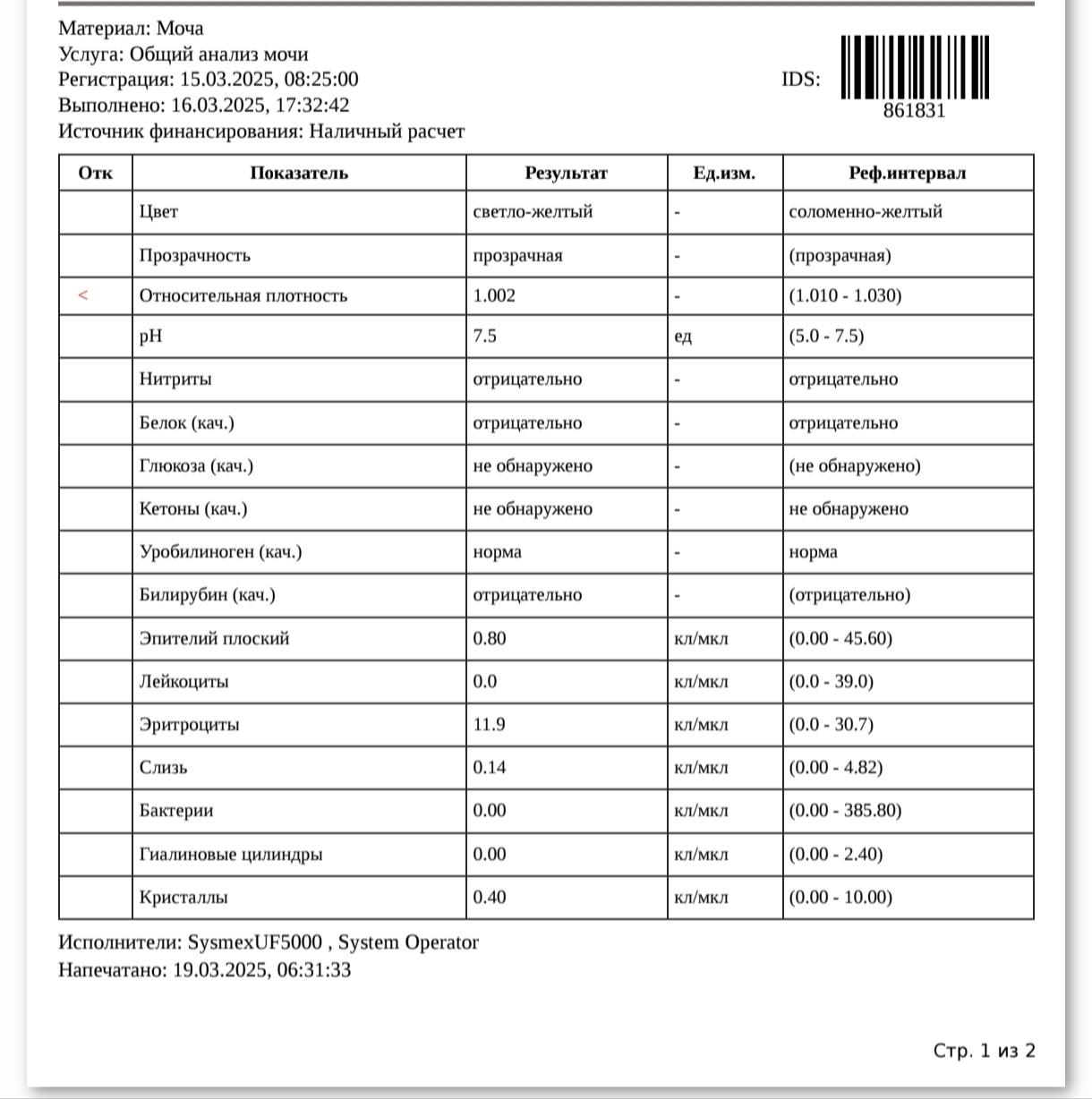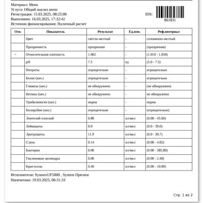 - Относительная плотность: 1.002 — ниже нормы (референс: 1.010–1.030). Это может указывать на снижение концентрационной способности почек, что требует дополнительного внимания.