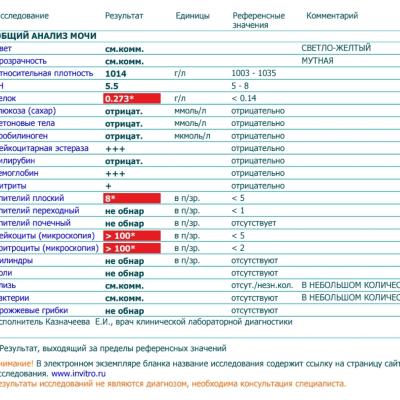 - Гемоглобин (+++) – может свидетельствовать о наличии крови в моче (гематурия).