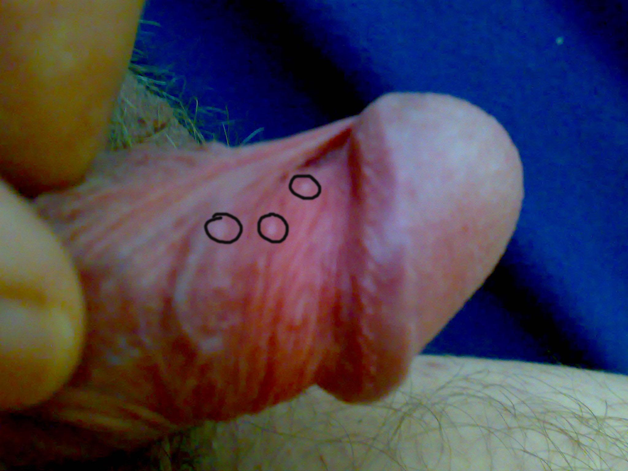 Я извиняюсь, Вы только что ответили на мой вопрос, но на самой головке папулы у меня давно, а вот на коже возле головки совсем недавно. Это овальные белые пузырьки, которые находятся под кожей. Я выделил их на фото.