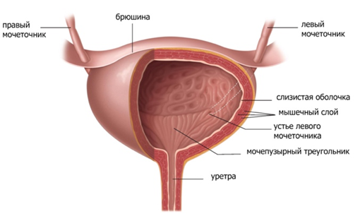 Мочевой пузырь – это мышечный полый орган для накопления мочи. Цистит – это воспалительный процесс слизистой (самой внутренней) оболочки мочевого пузыря (см. рисунок), который влияет на процесс накопления мочи в мочевом пузыре. Часто из-за воспаления слизистой у пациентки возникает учащенное мочеиспускание, малыми порциями, иногда по каплям, и все это проходит на фоне выраженного жжения, резей.